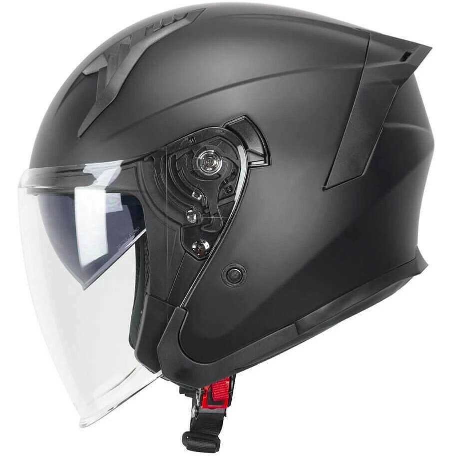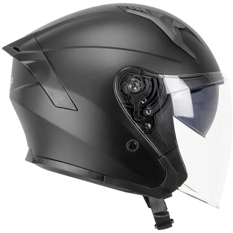 Casco jet dalle linee aggressive con spoiler posteriore. Dotato di visiera interna parasole a scomparsa e visiera esterna basculante dal campo visivo molto amplio. Gli interni termoformati estraibili e lavabili, il sistema di aerazione interna, anello antifurto al cinturino e fibbia micrometrica ne completano la dotazione.